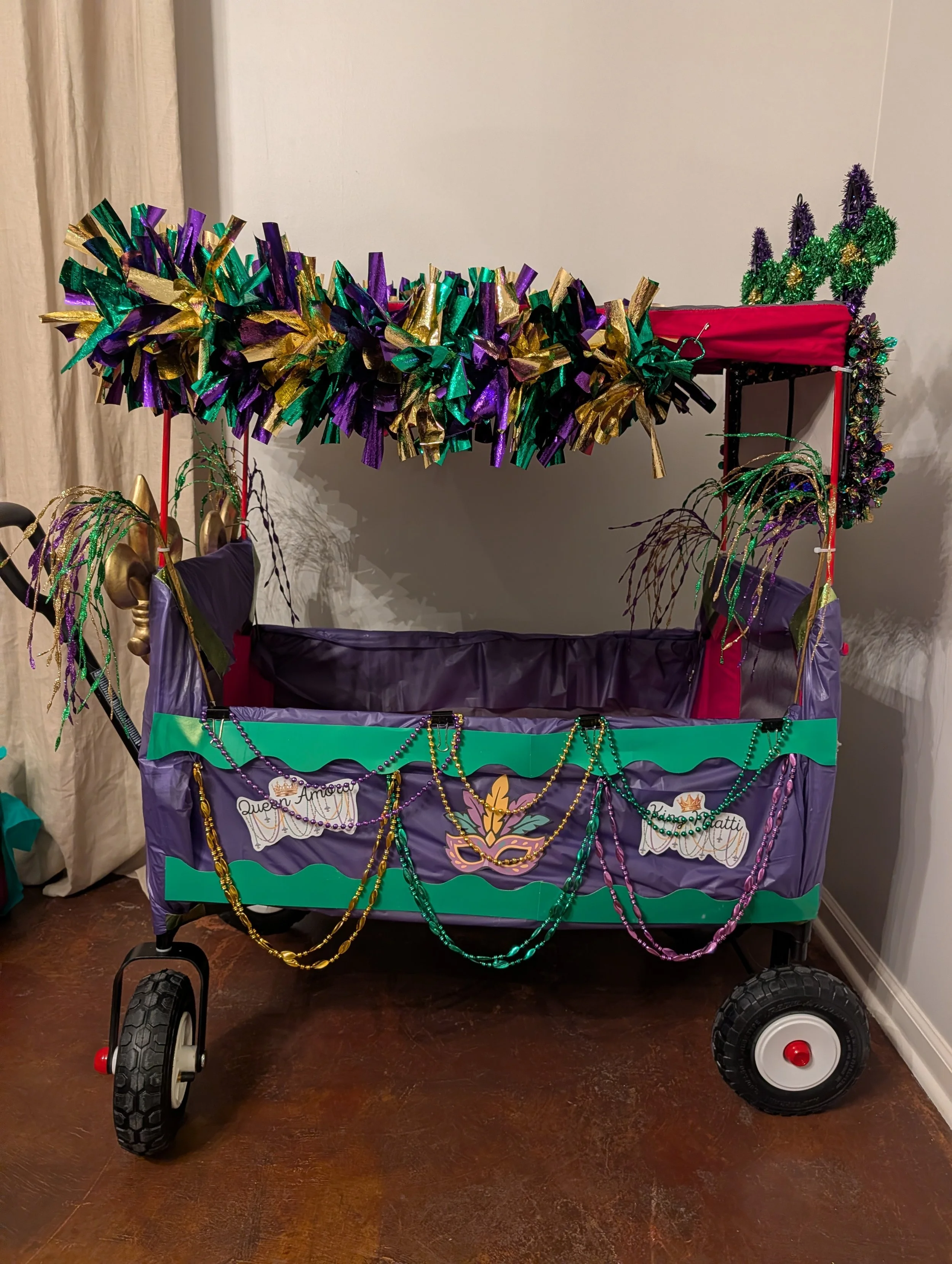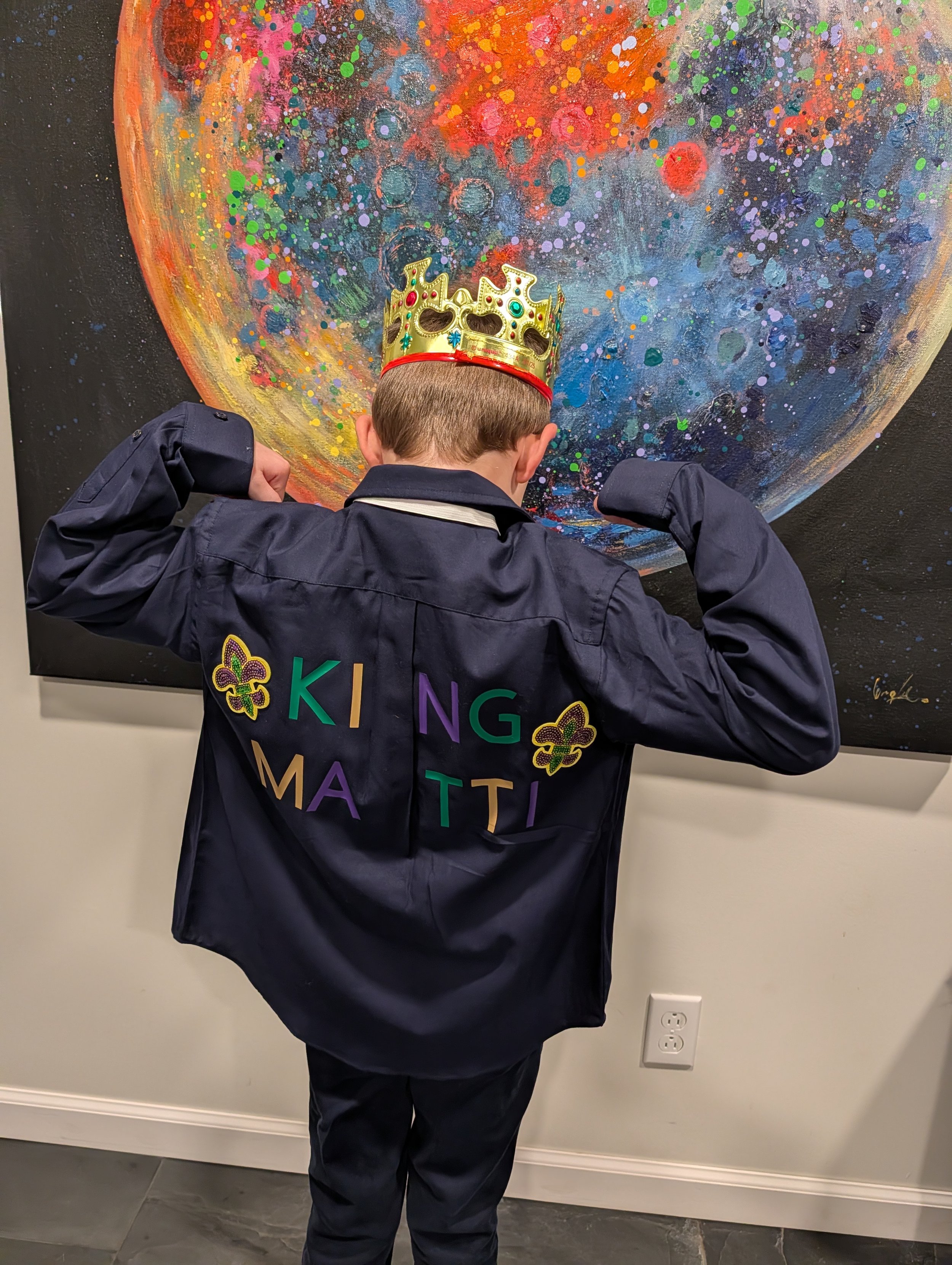 Auch die Schule veranstaltet ihre eigene Mardi-Gras-Parade und ähnlich wie beim Vogelschießen an den Grundschulen in Brunsbüttel und Umgebung gibt es eine Königin und einen König. In Neles Klasse mussten sich sowohl die Kinder als auch die Eltern damit einverstanden erklären, dass sich das Kind zur Wahl aufstellen lässt. Wie erwartet, wollte Nele das natürlich nicht, was ich erleichtert aufatmen ließ. Denn das Königpaar muss einen dekorierten und geschmückten Bollerwagen bereitstellen und das Kind mit dem Anlass entsprechend gekleidet sein. Das Königspaar wird dann von den Eltern durch die Parade gezogen, dabei wirft es Süßigkeiten, Perlenketten und ähnliches (natürlich ebenfalls von einigen Eltern der Klasse zur Verfügung gestellt). Umso überraschter waren wir dann über den Brief, den Matti nach Hause brachte: „Matti wurde als König der Klasse bestimmt! Glückwunsch!“. Ja, danke dafür… Auch Matti fand das alles ziemlich blöd, da er weder Lust hatte, König zu sein und besondere Klamotten für diesen Tag tragen zu müssen. Die Lehrerin meinte es natürlich gut und sah es als eine Art Belohnung für ihn und seine schulischen Leistungen. Sie hätte ihn zumindest fragen können, ob er das überhaupt möchte.